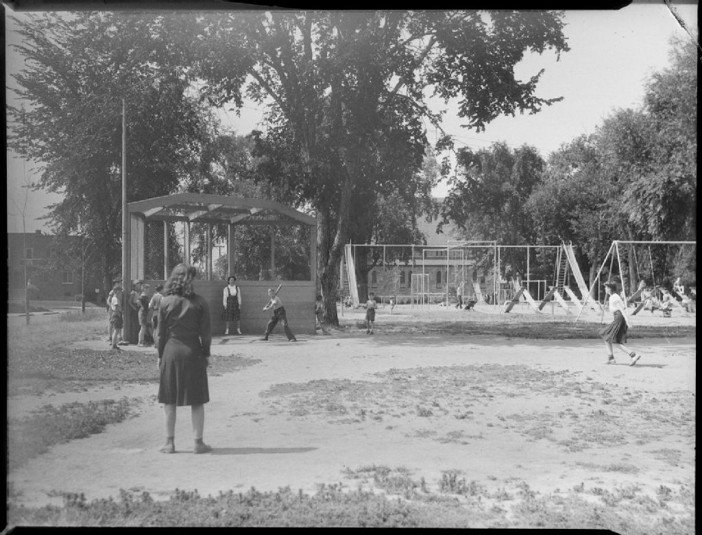 Des enfants jouent au base-ball au camp d'été du parc MacDonald de Montréal. À l'arrière-plan nous voyons des balançoires, des glissoires et des portiques à anneaux