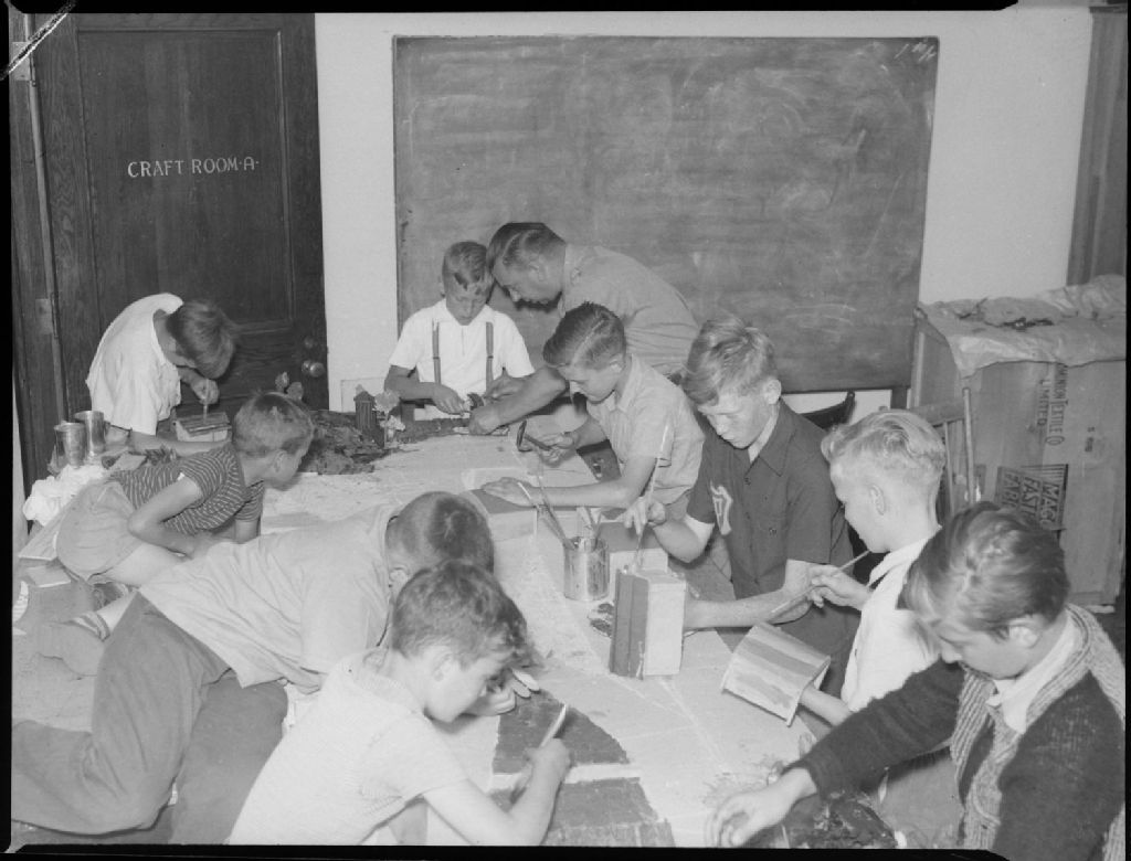 Des garçons fabriquent un aéroport miniature au camp d'été de la Young Men's Christian Association (Y.M.C.A.) de Verdun. Ils construisent des pistes et des hangars