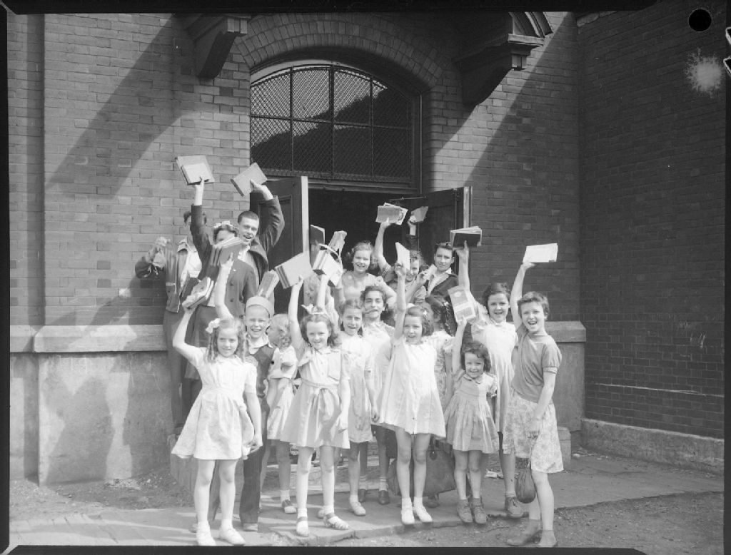 Des écolières et des professeurs brandissent leurs manuels scolaires avant de partir en vacances. Ils sont devant la porte d'entrée de l'école Edward VII située au 6080, avenue de l'Esplanade à Montréal