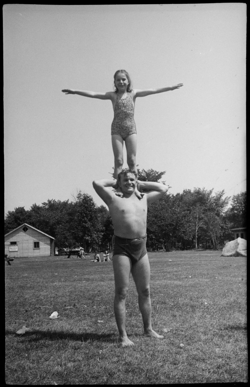 Audrey Shlakat est debout sur les épaules de Jerry Riberdy lors d'une sortie à la plage Malo du camp d'été de la succursale «North End» de la Young Men's Christian Association (Y.M.C.A.) de Montréal