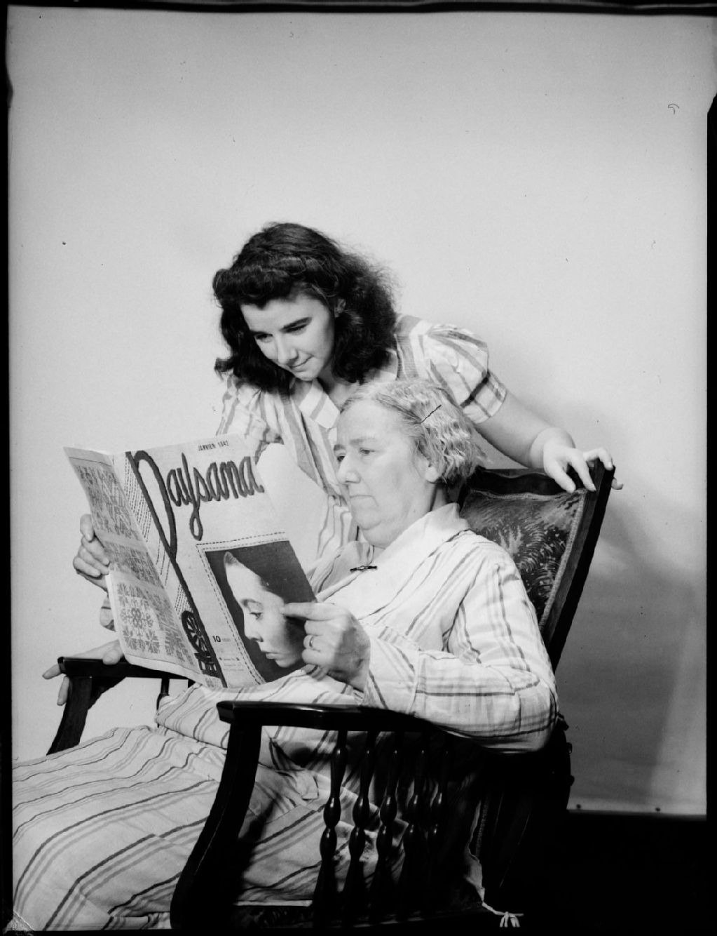 Madame Arthur Poirier, née Yvonne de Saint-Dizier, lit la revue «Paysana». La mère du photographe Conrad Poirier est assise dans une chaise berçante et sa fille Lilian lit par-dessus son épaule