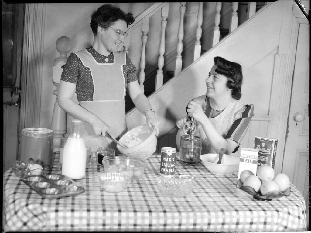 Deux femmes font à manger autour d'une table avec différents ustensiles de cuisine et des ingrédients tels que Magic Baking Powder, Redpath Sugar et Windsor Salt