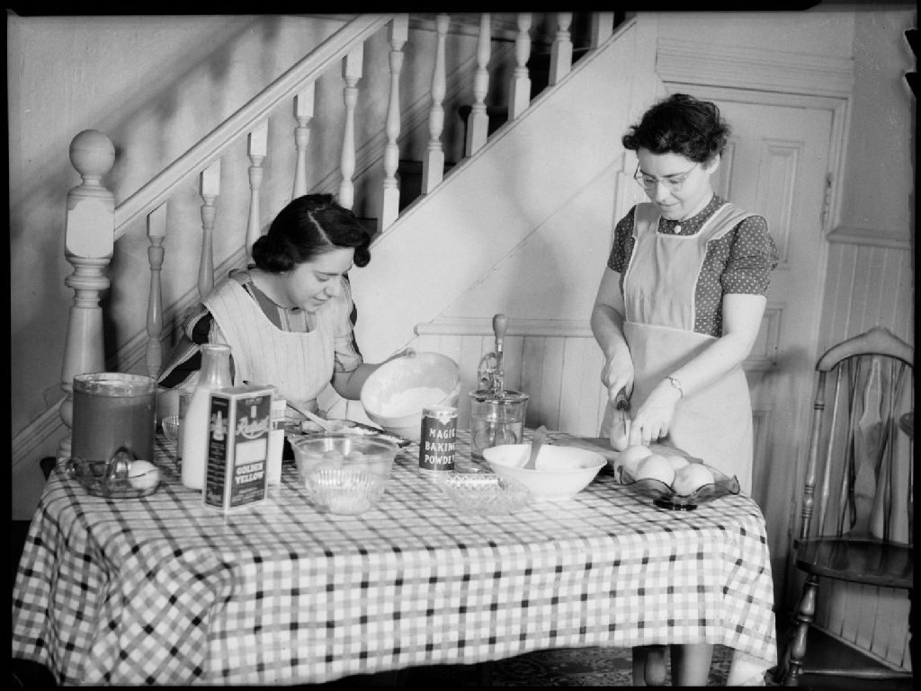Deux femmes font à manger autour d'une table avec différents ustensiles de cuisine et des ingrédients tels que Magic Baking Powder et Redpath Sugar