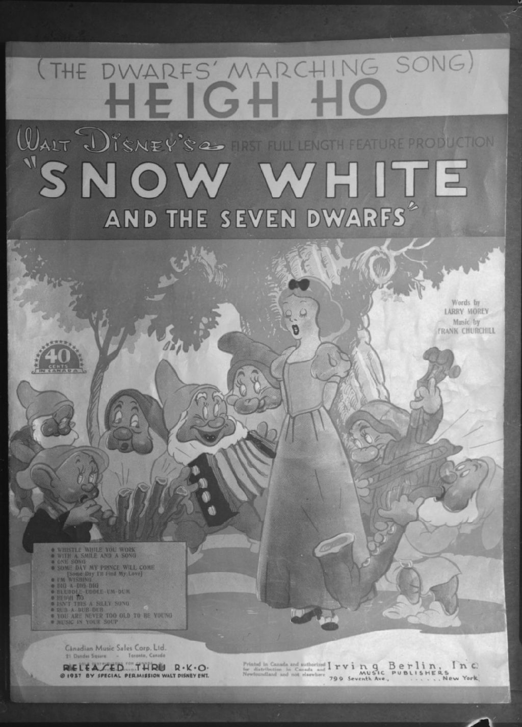 Nous voyons la page couverture de la partition de la chanson «Heigh Ho» dont les paroles sont de Larry Morey et la musique de Frank Churchill. Cette chanson est extraite du film d'animation de Walt Disney «Snow White and the Seven Dwarfs»
