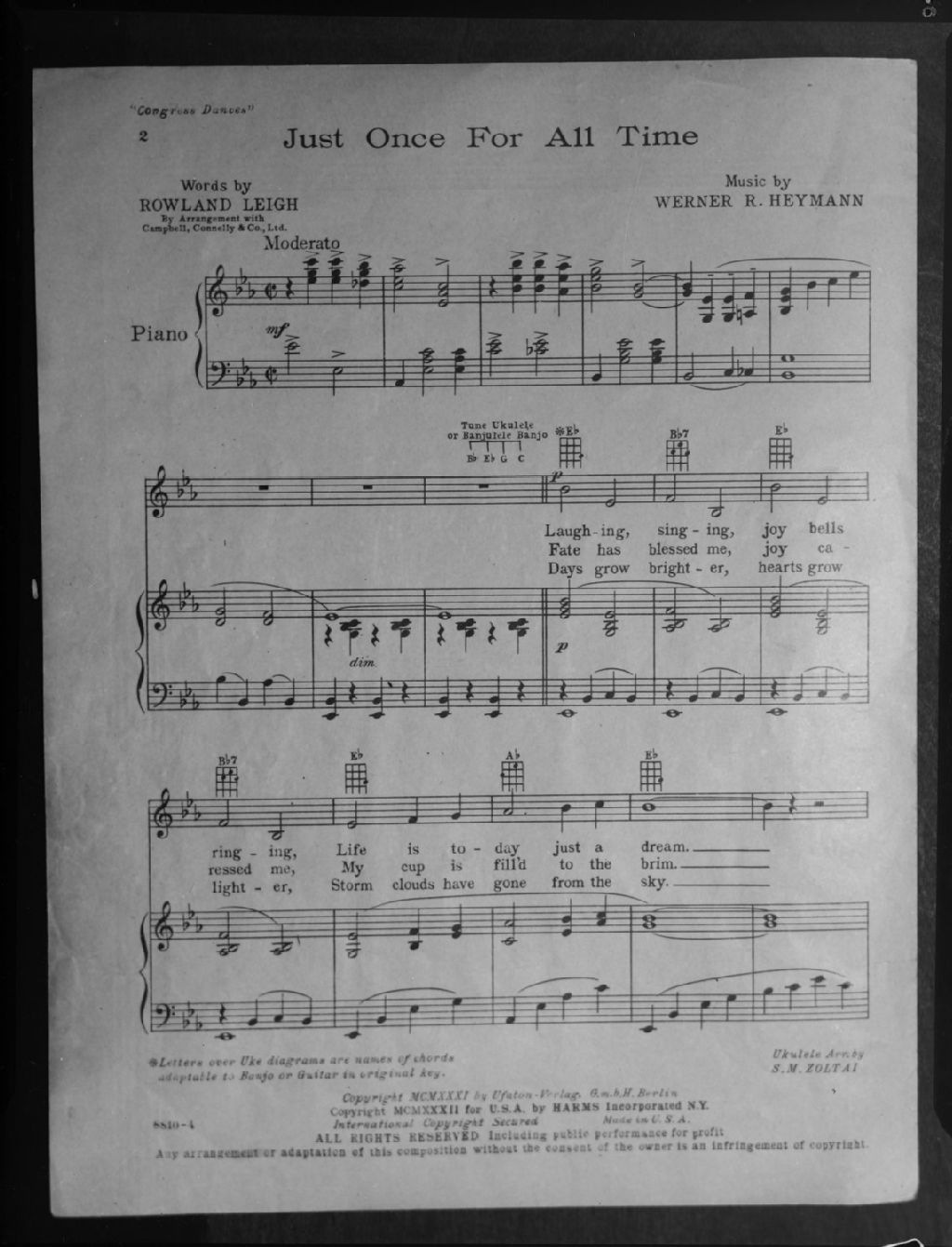 Nous voyons une page de la partition de la chanson «Just Once for All Time» dont les paroles sont de Rowland Leigh et la musique de Werner R. Heymann