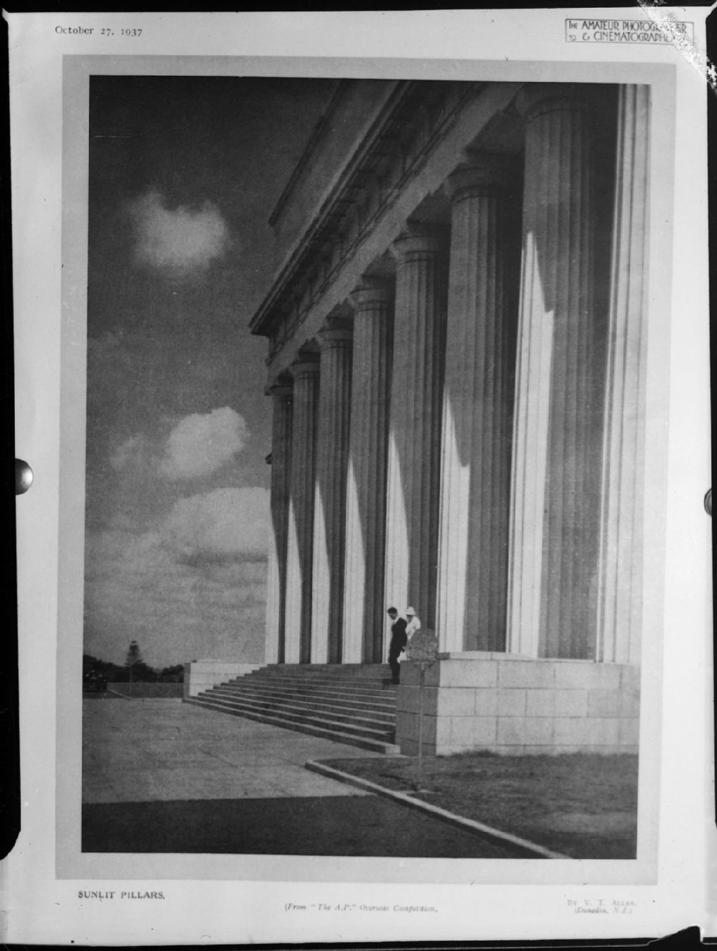 Nous voyons une photographie de V. T. Allan titrée «Sunlit Pillars». Cette photographie des colonnes extérieures d'un édifice est extraite du numéro d'octobre 1937 de la revue «The Amateur Photographer and Cinematographer»