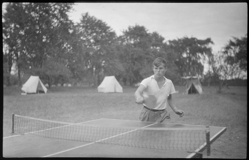 Garçon jouant au tennis de table (ping-pong). En arrière-plan nous apercevons des tentes de camping, 27 août 1936, Archives nationales à Montréal, Fonds Conrad Poirier, (06M,P48,S1,P781), Poirier, Conrad.