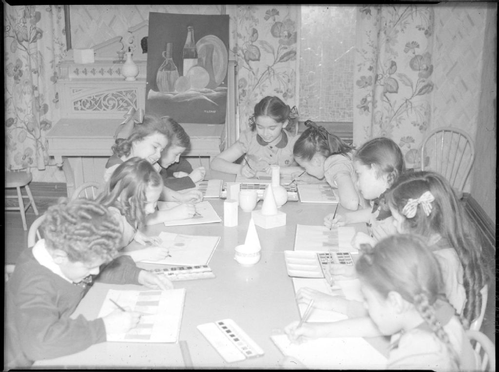 Des enfants participent à un atelier de peinture du Théâtre des Petits. Ils peignent assis autour d'une grande table