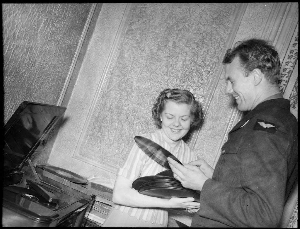 Un soldat de l'armée de l'air, Jack McClelland, et Evelyn Kimber choisissent le disque qu'ils vont faire tourner sur le gramophone. Ils sont dans le salon de la maison d'accueil des officiers