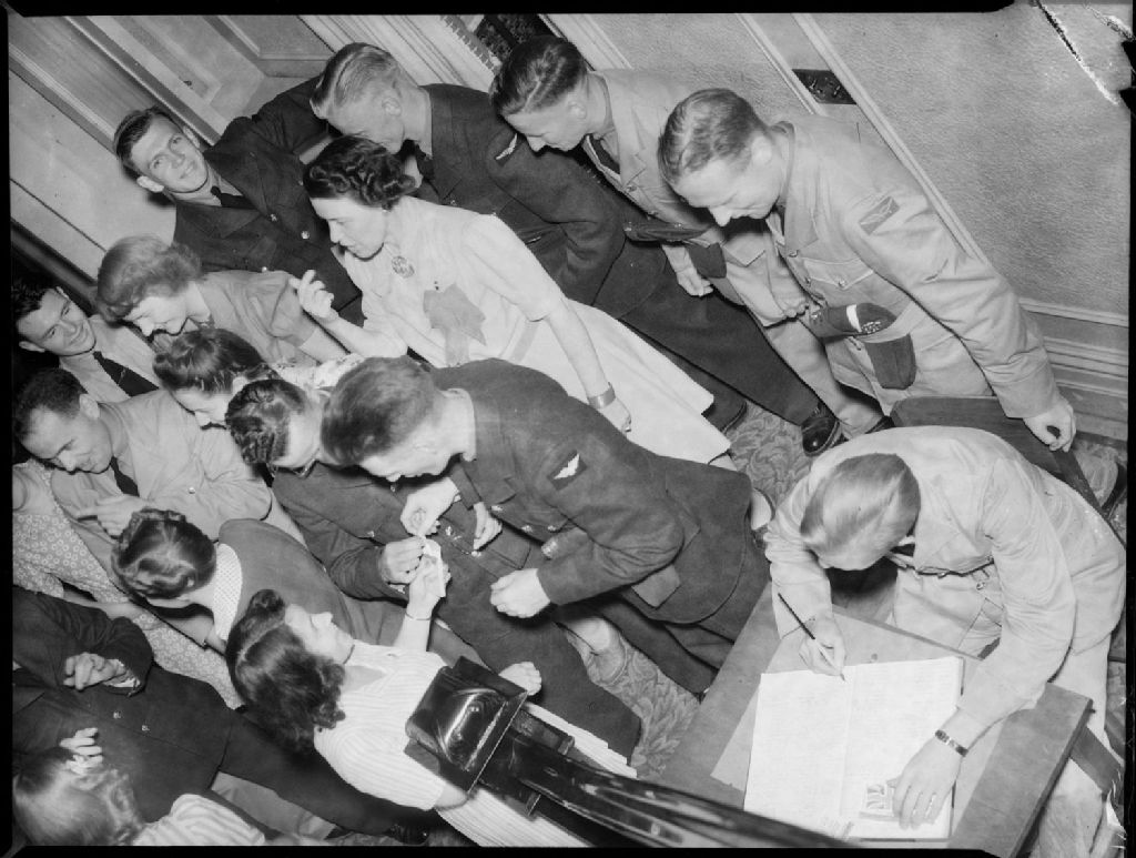 Des militaires de l'armée de l'air et des jeunes femmes conversent lors d'une rencontre à la maison d'accueil des officiers