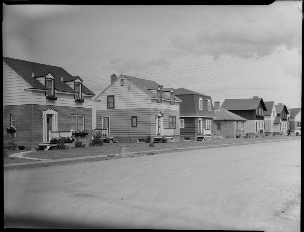 Nous voyons des maisons individuelles de la Cité-jardin du tricentenaire de la fondation de Montréal. Ce projet de ville modèle situé dans le quartier Rosemont vise à offrir à chaque famille ouvrière une petite maison, grâce à la mise sur pied d'un mouvement coopératif d'épargne et d'achats