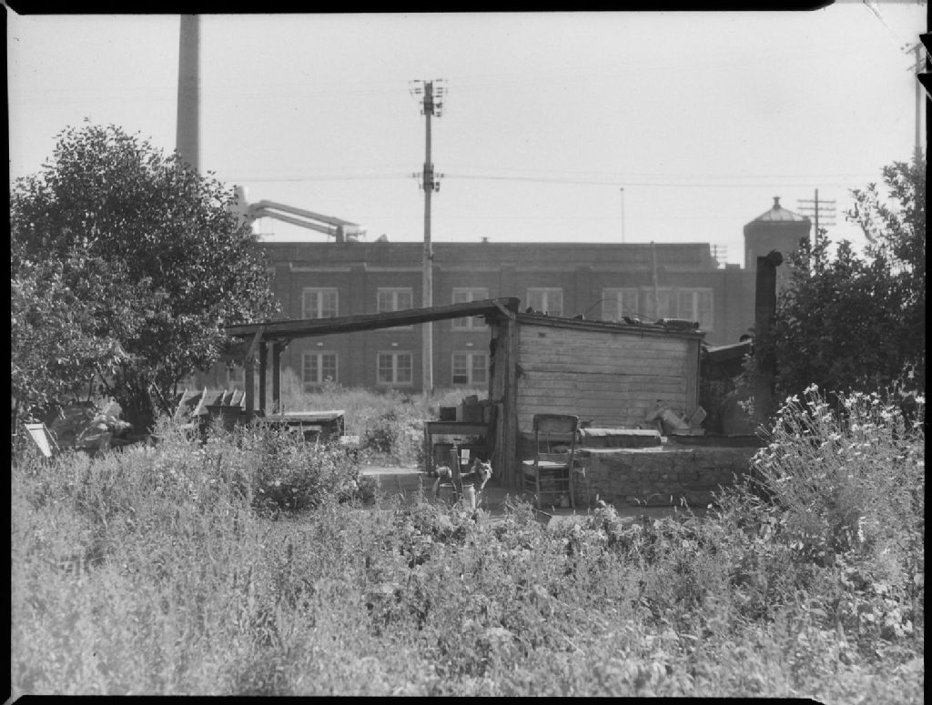 Nous voyons une remise de planches, une table, des chaises et un chien au milieu d'un jardin peu aménagé