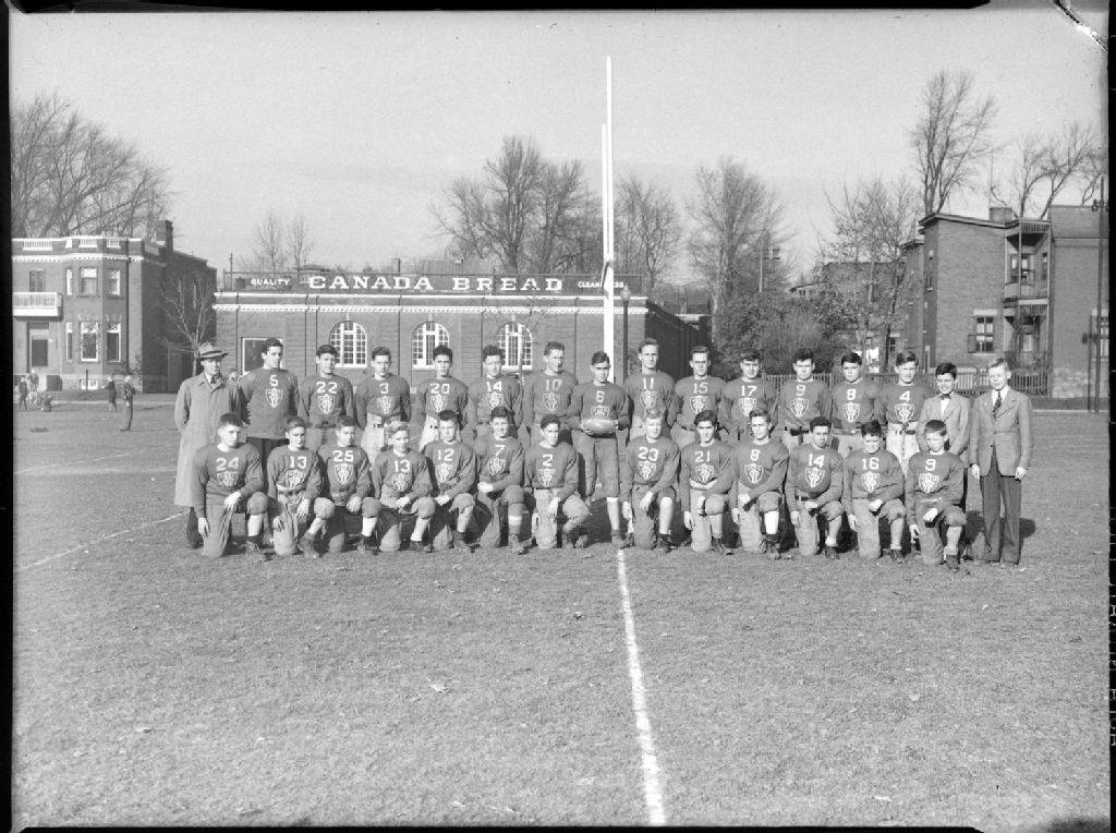 Nous voyons les joueurs et les entraîneurs de l'équipe de football de la «Westmount Intermediate School Academy». Les membres de l'équipe championne de 1942 sont en uniforme sur un terrain de football près de la fabrique «Canada Bread Co Ltd» située au 325, avenue Melville