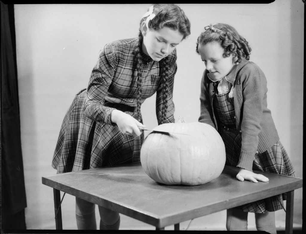 Une fillette avec de longues tresses, Margaret Findlay, taille une citrouille d'Halloween sous les yeux de sa jeune soeur Helen