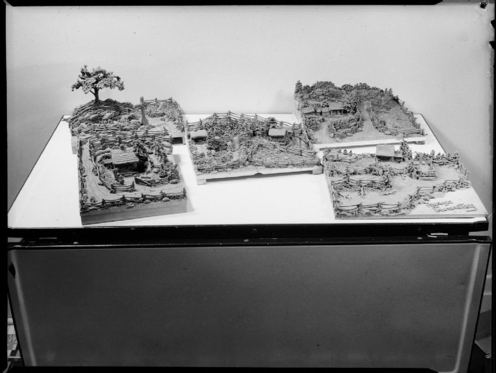 Nous voyons un modelage en pâte à modeler de bâtiments entourés d'arbres et de clôtures. Monsieur Croteau, domicilié au 8144 rue Foucher à Montréal, a exécuté cette oeuvre
