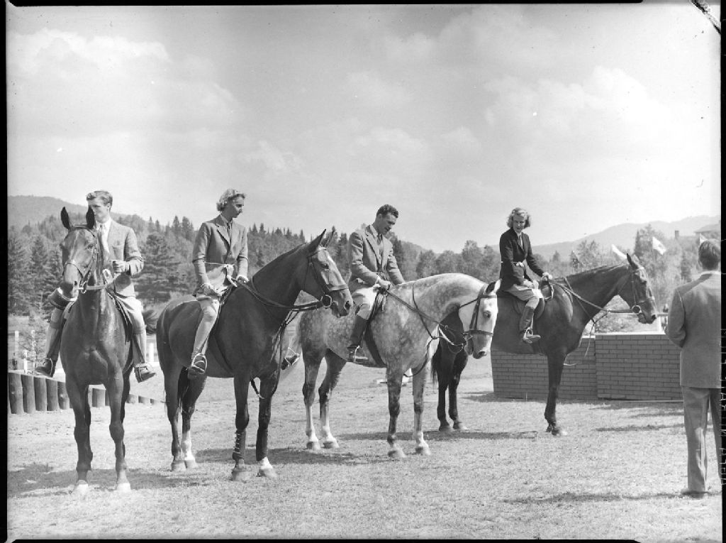 Nous voyons quatre jockeys montés sur leur cheval. Ce sont les gagnants d'une compétition équestre, le «Alpine Inn Horse Show», présentée à l'hôtel «Alpine Inn» à Sainte-Marguerite-du-Lac-Masson dans les Laurentides