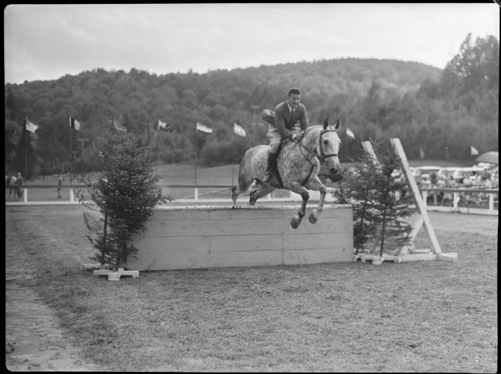 Horse. Alpine Inn Horse Show. Robert Bruck on Bartender. Class 3, 29 août 1942, Archives nationales à Montréal, Fonds Conrad Poirier, (06M,P48,S1,P8021), Poirier, Conrad.