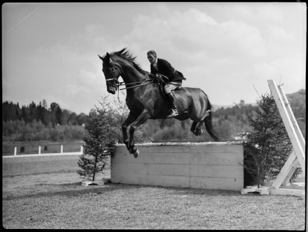 Horse. Alpine Inn Horse Show. Len Lehand on Royal Banner. Class 3, Août 1942, Archives nationales à Montréal, Fonds Conrad Poirier, (06M,P48,S1,P8023), Poirier, Conrad.