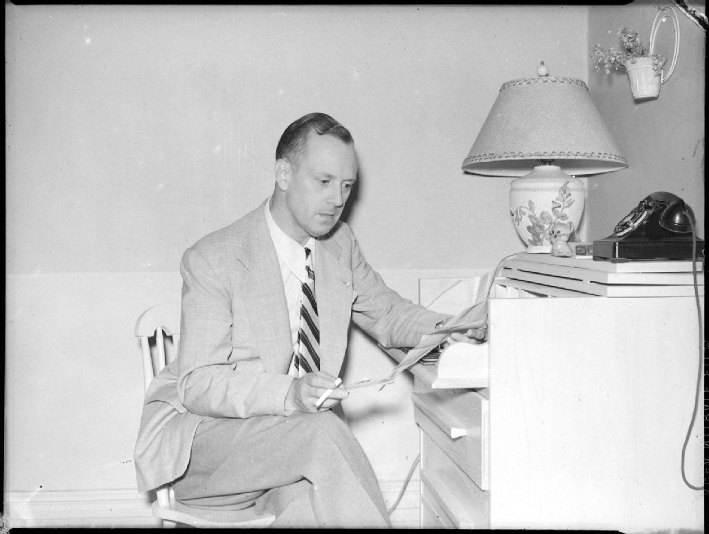 Jacques Catelain, réalisateur de films d'origine française, lit un document assis à un secrétaire
