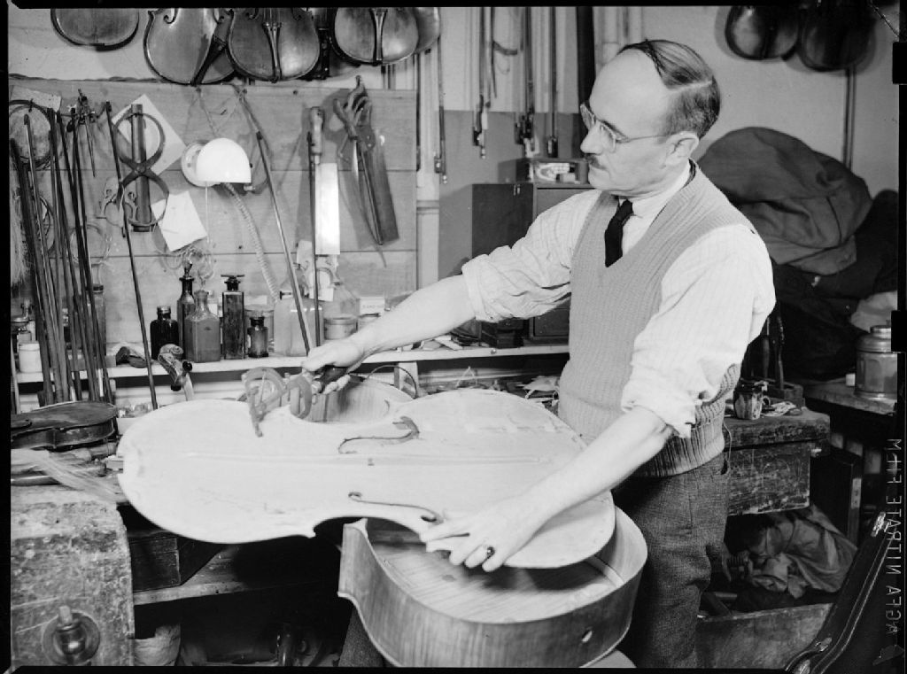 Monsieur Forget, luthier, pose à l'aide de serre-joint une table d'harmonie sur la caisse de résonance d'un violoncelle