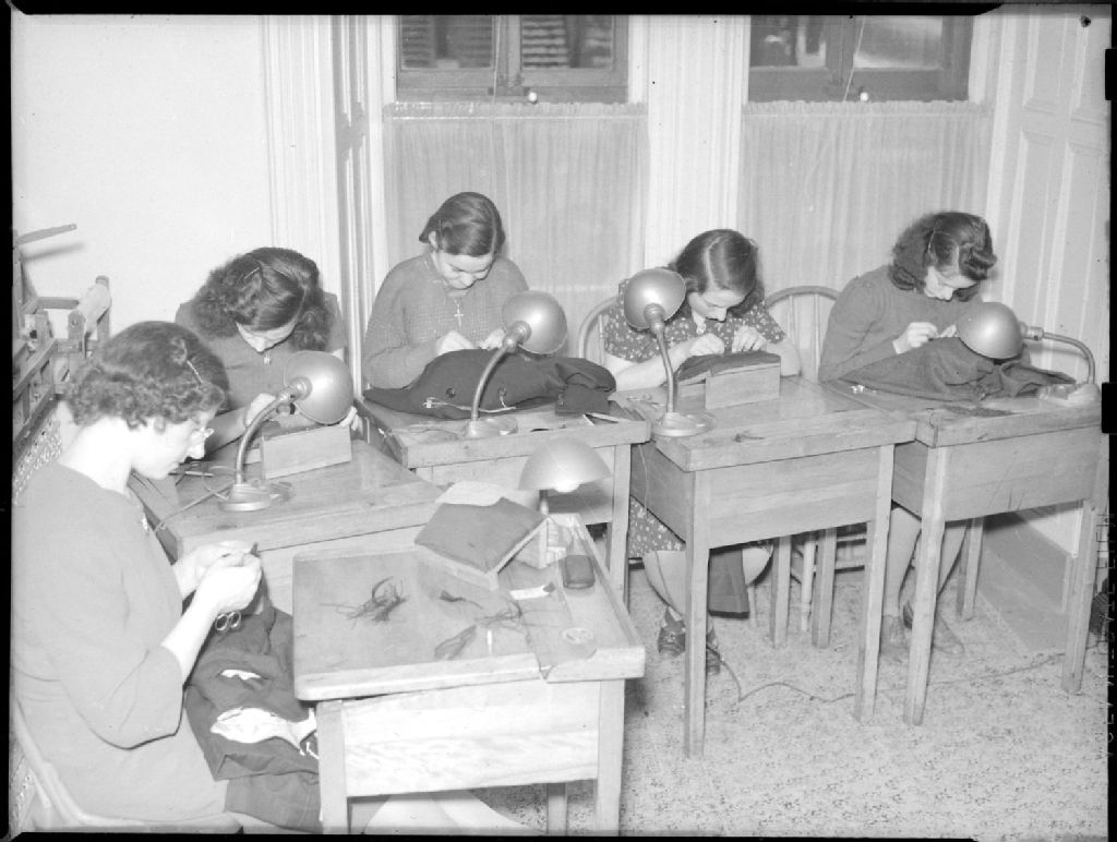 Des jeunes filles handicapées font des travaux d'aiguille dans la salle de couture de l'«Oeuvre aux enfants infirmes» située rue Saint-Denis à Montréal