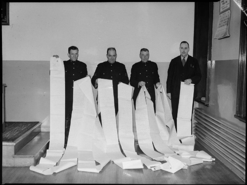 Quatre policiers de Westmount tiennent une longue lettre manuscrite de 127 pieds