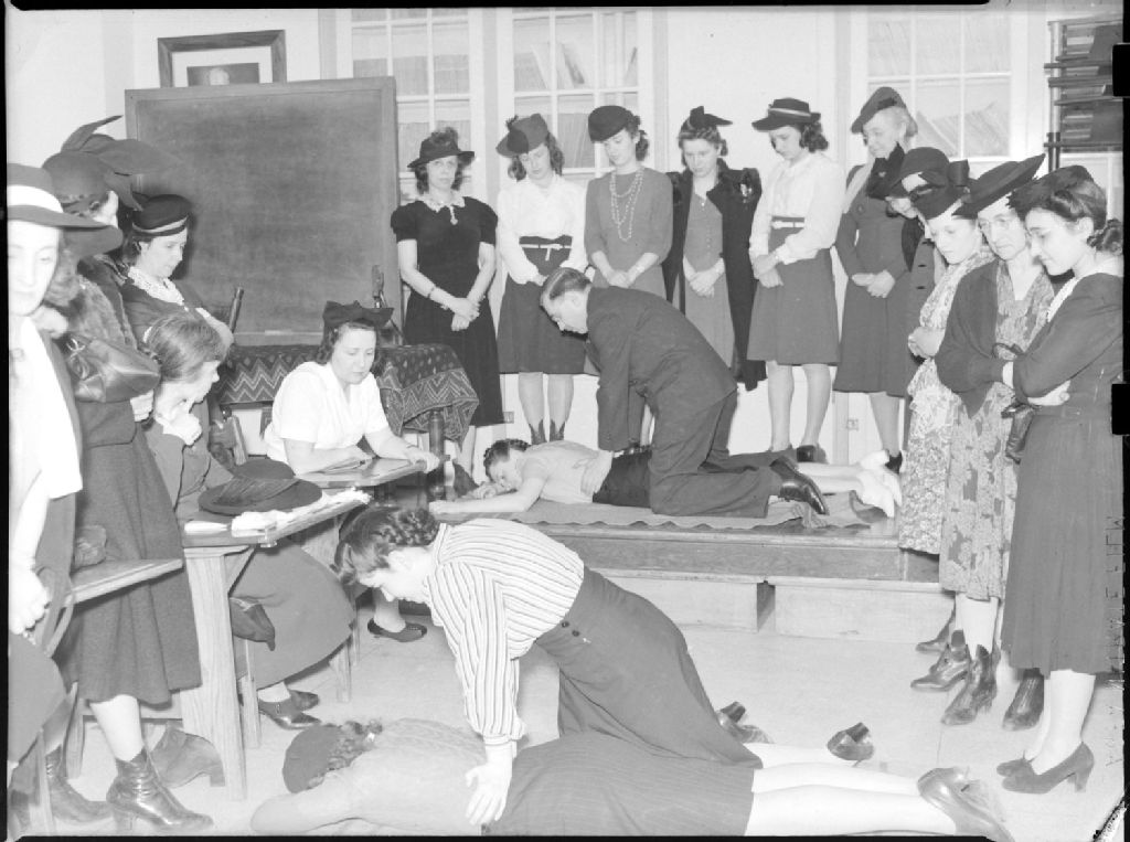 News. St-Justine Hospital First Aid Class, 6 avril 1942, Archives nationales à Montréal, Fonds Conrad Poirier, (06M,P48,S1,P8079), Poirier, Conrad.