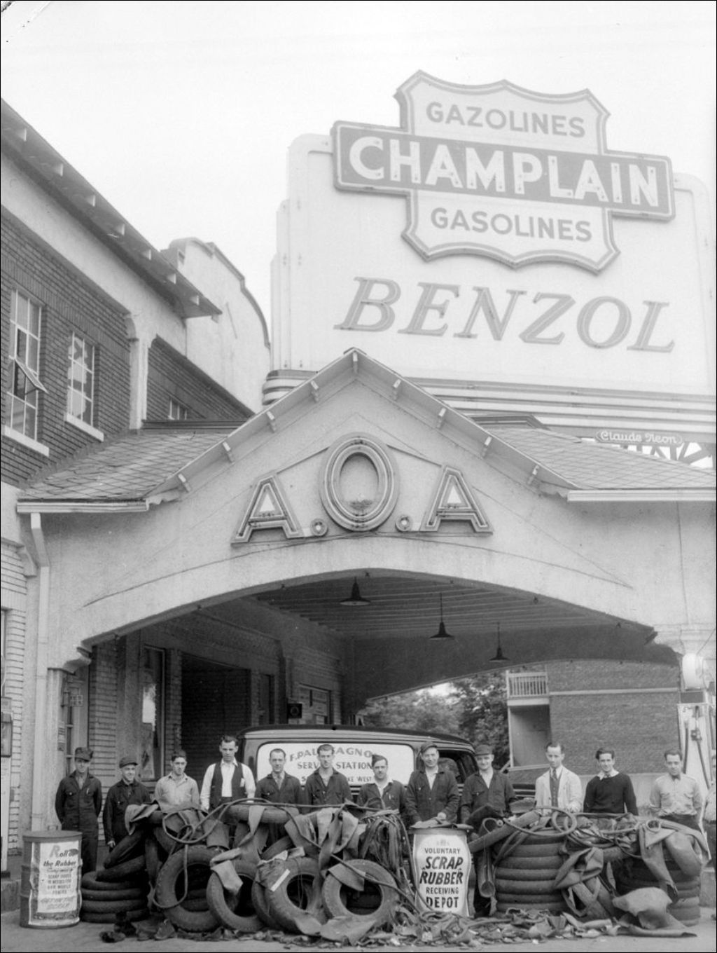 Nous voyons des ouvriers devant la station-service de F. Paul Gagnon située au 5390, rue Sherbrooke Ouest à Montréal. Le caoutchouc est récupéré à cette station-service puis recyclé pour approvisionner les troupes d'outre-mer. À l'arrière-plan, une enseigne lumineuse au néon annonce les «Gazolines Champlain Benzol»