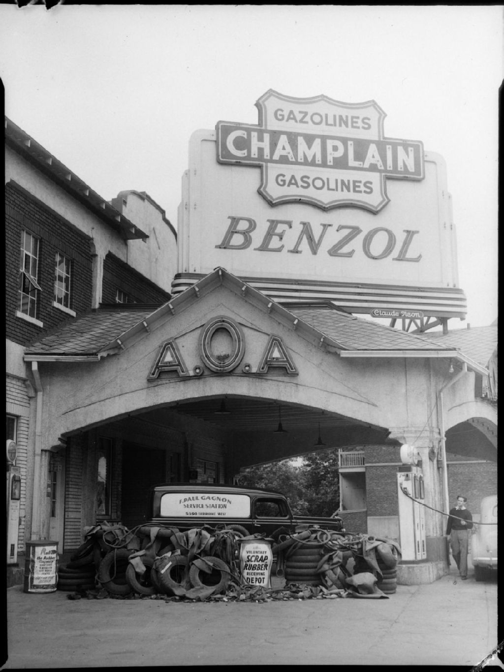 Nous voyons un tas de vieux pneus et d'autres articles en caoutchouc devant la station-service de F. Paul Gagnon située au 5390, rue Sherbrooke Ouest à Montréal. Le caoutchouc est récupéré à cette station-service puis recyclé pour approvisionner les troupes d'outre-mer. À l'arrière-plan, une enseigne lumineuse au néon annonce les «Gazolines Champlain Benzol»