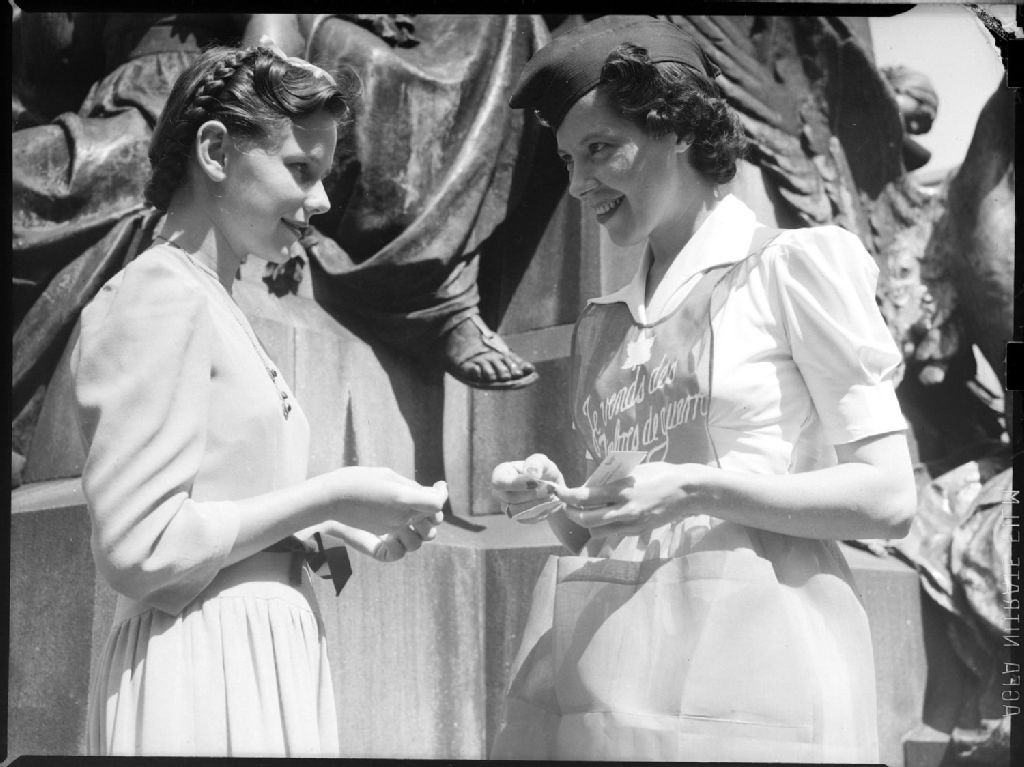 Margaret Findlay achète des timbres de guerre vendus par Helen Martin, Miss Canada, devant le monument au roi Edouard VII au square Phillips à Montréal