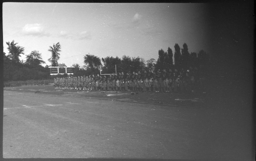 Présentation des joueurs de deux équipes de football au stade Percival Molson de l'Université McGill à Montréal. Une des équipes est le «Montreal Indians»