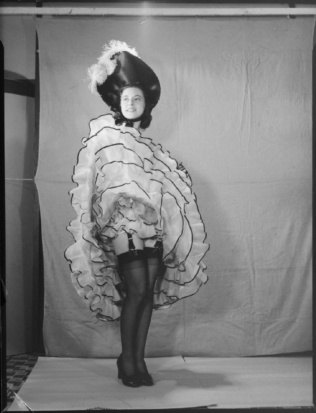 Dorothy Cunningham, vêtue en danseuse de French-cancan, soulève une jupe qui révèle des bas à jarretelles