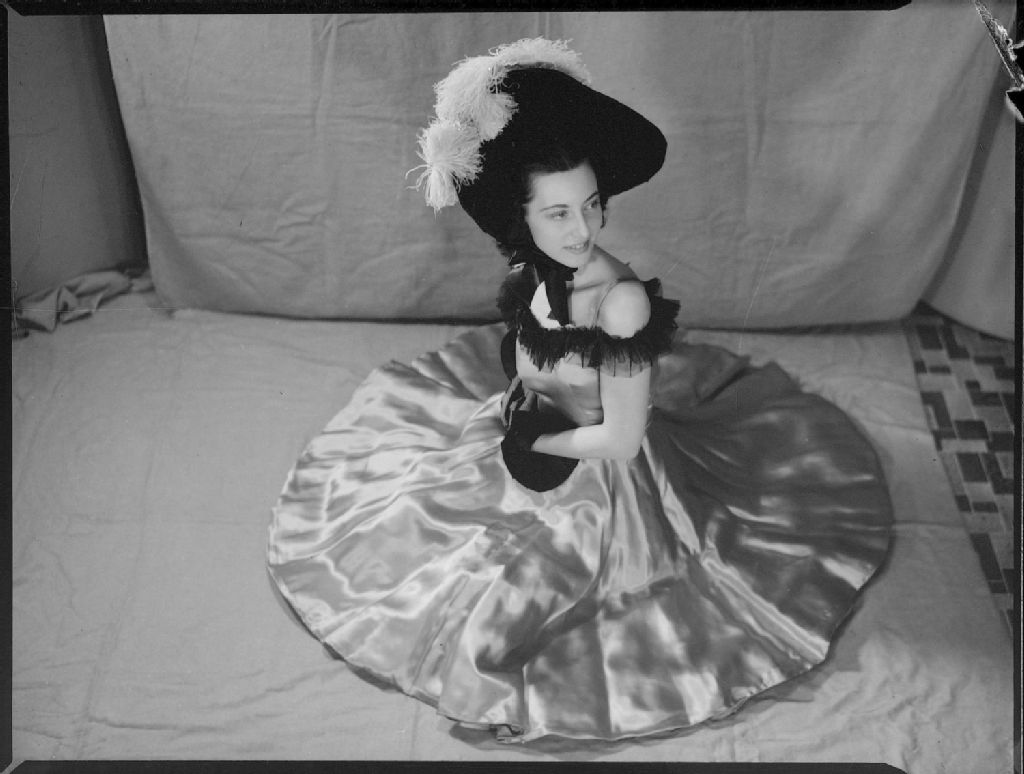 Dorothy Cunningham, vêtue en danseuse de French-cancan, est assise sur le plancher
