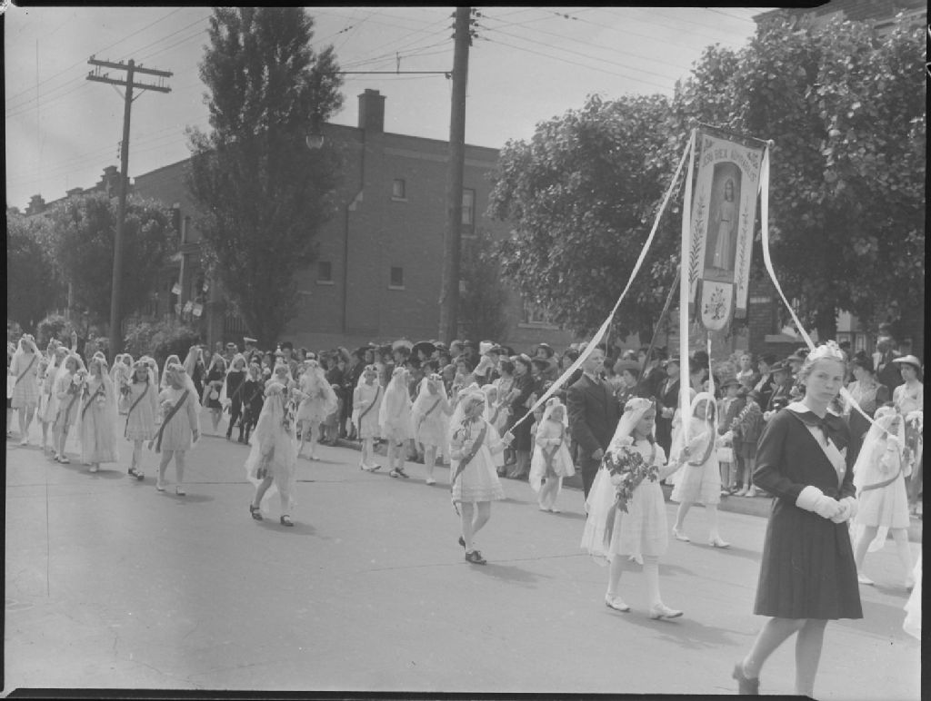 Nous voyons une procession de la Fête-Dieu dans les rues de Montréal. Des petites filles, des Enfants de Marie, sont coiffées d'un voile maintenu par une couronne surmontée d'une croix, tiennent des fleurs et suivent le porteur d'une bannière représentant Jésus