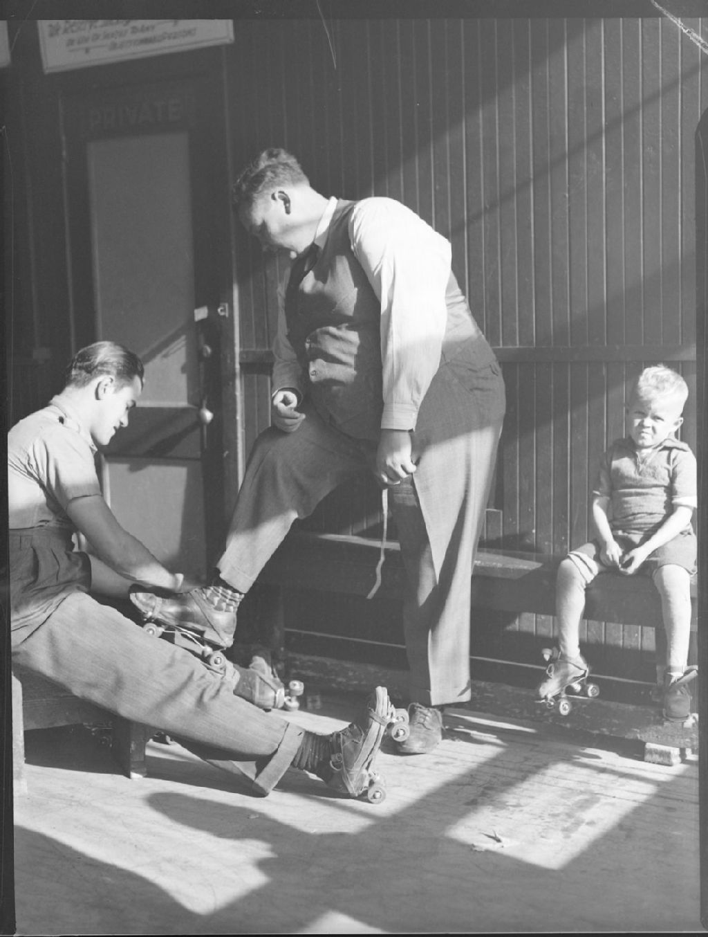 Skating. Roller Skating at Stadium. Mr. Bernard, 15 octobre 1942, Archives nationales à Montréal, Fonds Conrad Poirier, (06M,P48,S1,P8180), Poirier, Conrad.