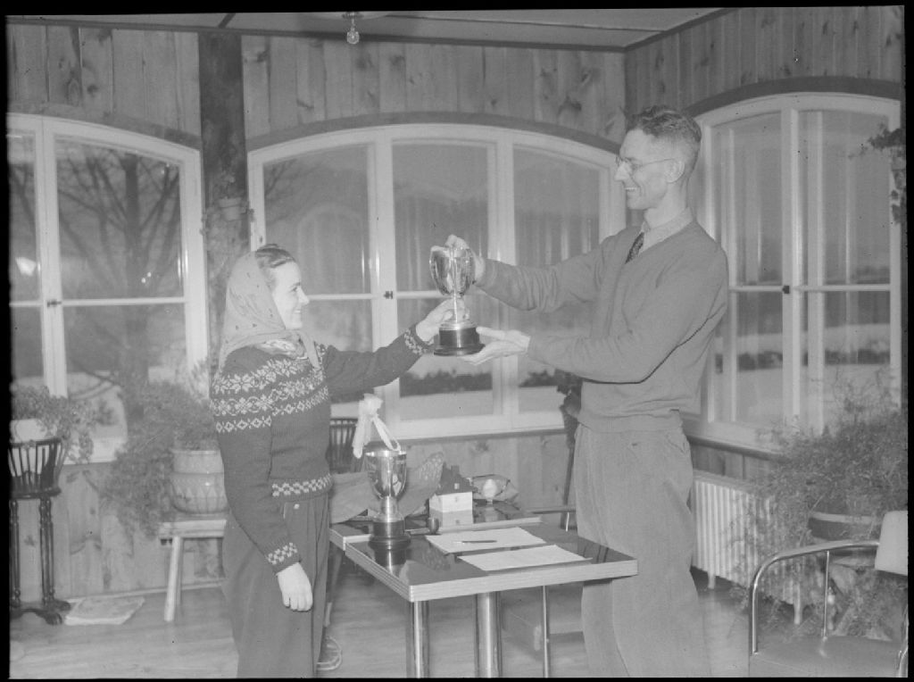 Yvonne Godmer reçoit le trophée «Penguin» pour sa victoire aux compétitions de ski de fond au chalet Cochand à Sainte-Marguerite-du-Lac-Masson dans les Laurentides