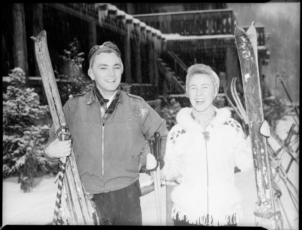 Phillis Henry de Montréal et Monty Wood de Toronto tiennent leurs skis de fond. Ils sont près de l'hôtel «Alpine Inn» à Sainte-Marguerite-du-Lac-Masson dans les Laurentides