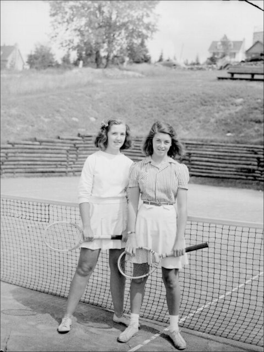 Monique Dufresne et Lise Desjardins, tenant leur raquette, sont debout près du filet d'un court de tennis de l'hôtel Le Chantecler à Sainte-Adèle dans les Laurentides