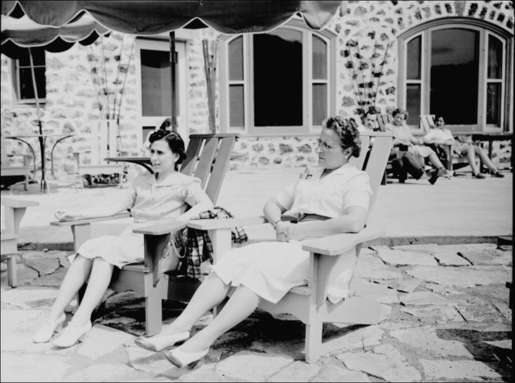 Mesdames W. Lavallée et L. Grégoire sont assises dans des fauteuils de jardin en bois. Elles conversent sous un parasol de la terrasse de l'hôtel Le Chantecler à Sainte-Adèle dans les Laurentides