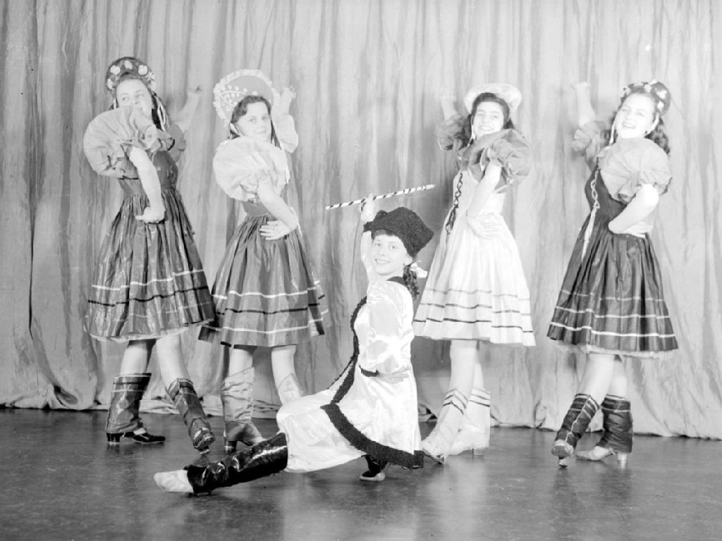 Cinq danseuses, en costume folklorique russe, présentent un numéro de danse russe dans la revue musicale «Thumbs Up»