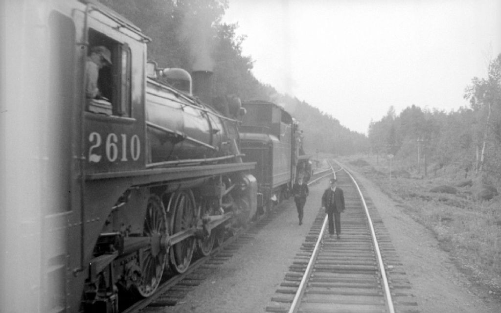 Deux aiguilleurs se dirigent vers le conducteur de la locomotive à vapeur arrêtée près d'un croisement de voie ferrée dans les Laurentides