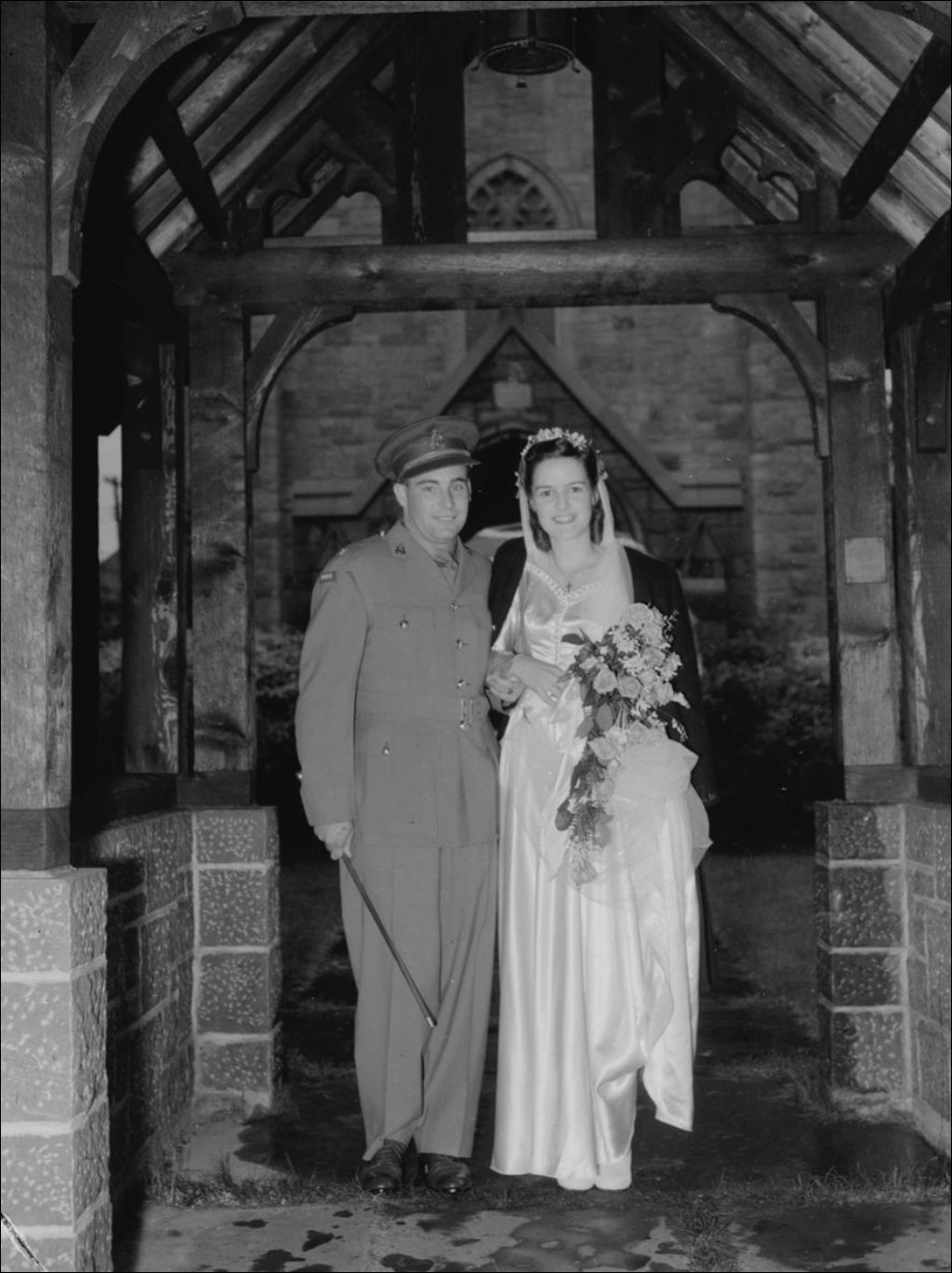 Nous voyons les nouveaux mariés Morris-Moore sous une arcade en pierre. Monsieur Moore porte l'uniforme de l'Armée royale du Canada