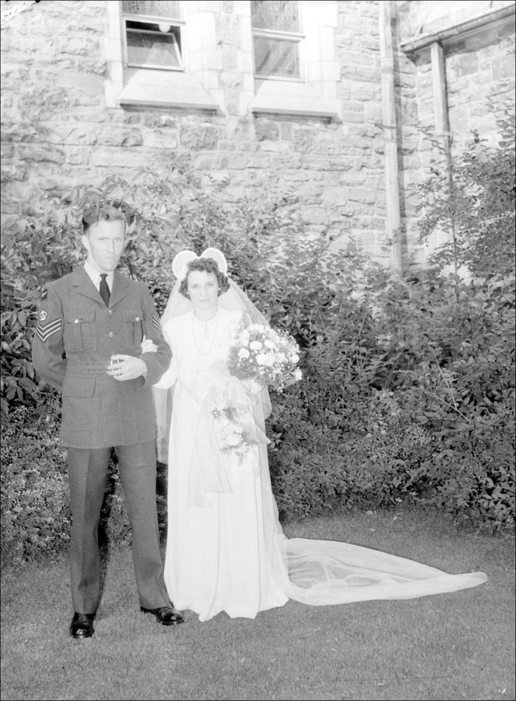 Nous voyons les nouveaux mariés Madame et Monsieur Robinson. Celui-ci porte l'uniforme de l'Aviation royale du Canada. Ils sont près d'une église de pierres