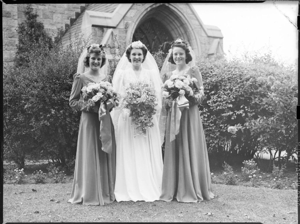 Nous voyons la mariée, madame John Holmes née McKerley, et ses deux demoiselles d'honneur. Elles sont près de l'église anglicane St. Phillip's à Montréal-Ouest