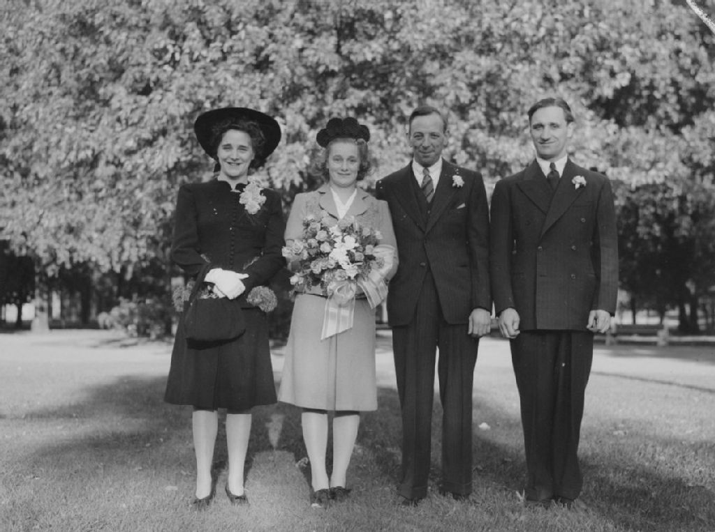 Les nouveaux mariés, Alma Ann Morrisson et E. A. Morin, et leurs témoins sont dans le jardin de la «Congregational Church» située à l'intersection des rues Hibernia et Wellington à Montréal
