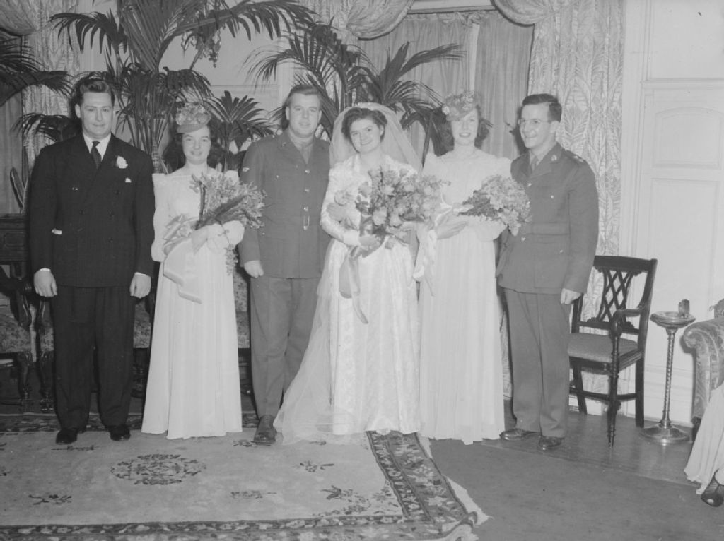 Nous voyons les nouveaux mariés, Betty et le capitaine A. E. Martin, et leurs demoiselles et garçons d'honneur. Le marié et un garçon d'honneur portent l'uniforme militaire. Ils sont dans une salle de réception