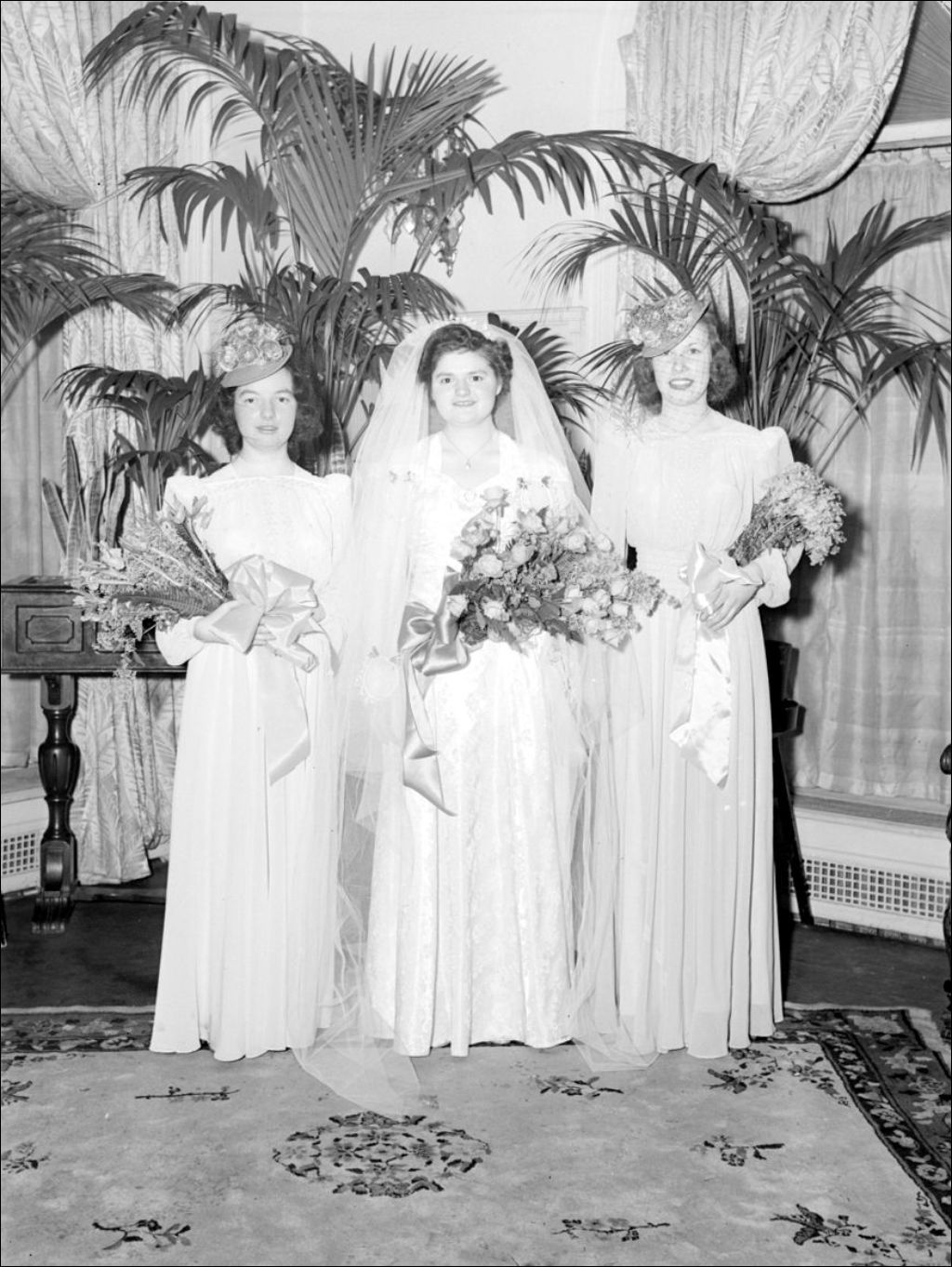 Nous voyons la nouvelle mariée, Betty Martin, et ses deux demoiselles d'honneur dans la salle de réception du mariage
