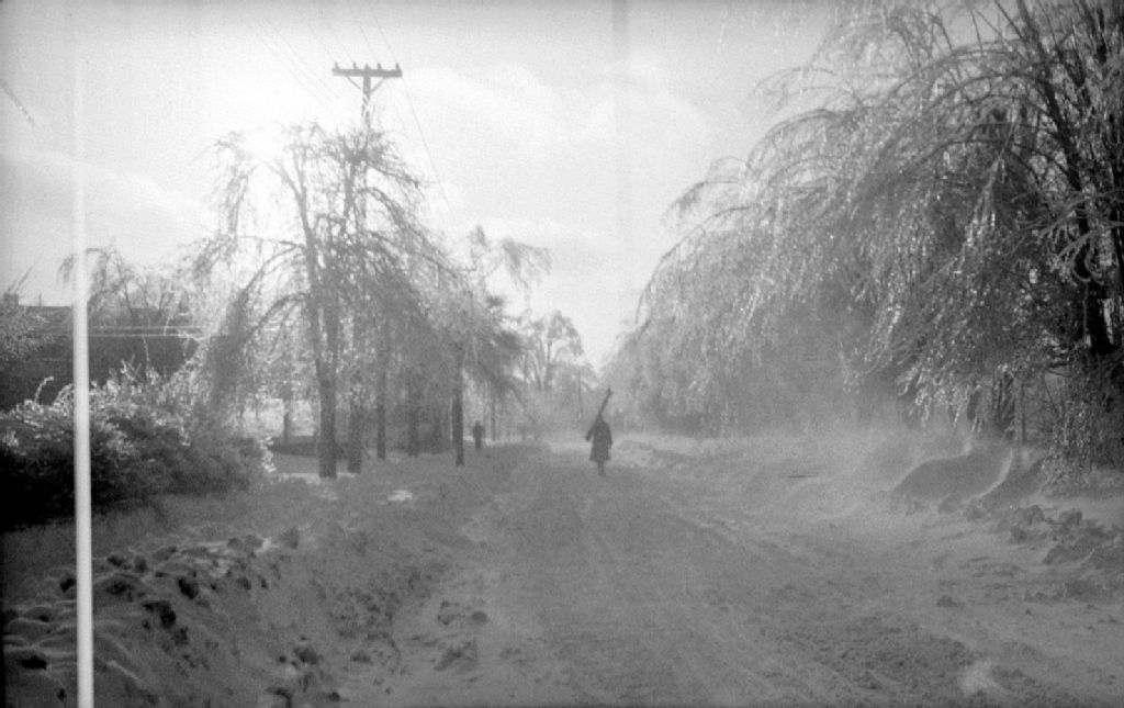 Nous voyons un skieur et un promeneur avec ses skis sur l'épaule au milieu du chemin Broughton à Montréal-Ouest. Les branches des arbres sont courbées sous le poids de la neige
