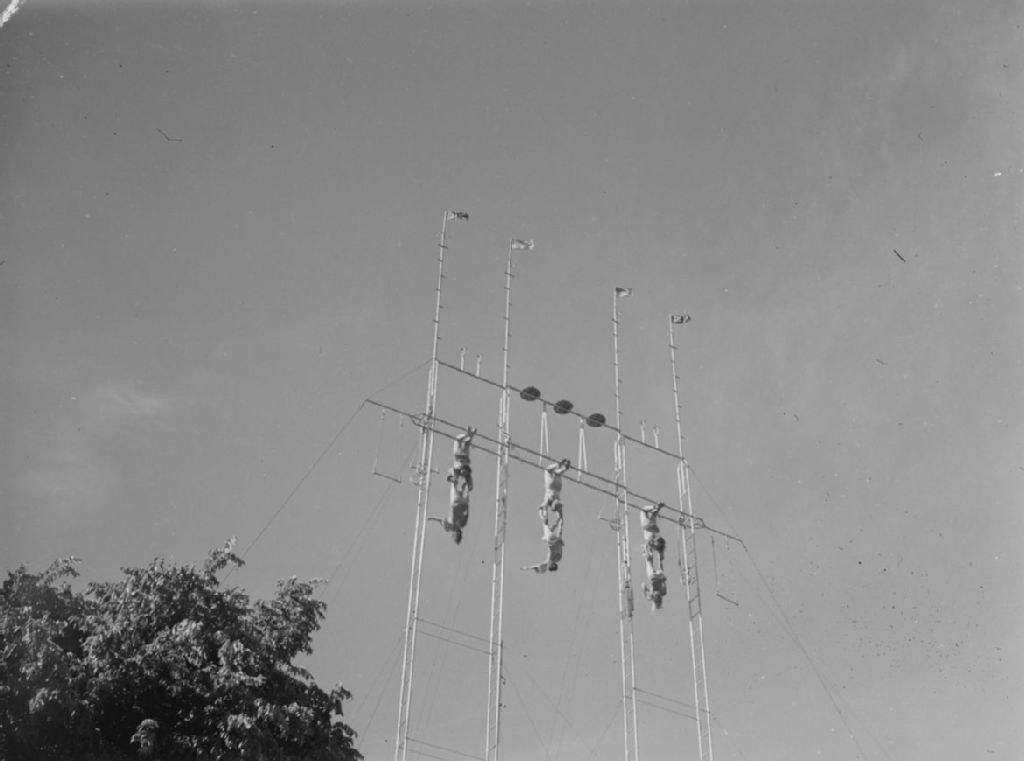Nous voyons six acrobates du «Hollywood Sky Ballet» suspendus deux par deux au sommet d'une haute structure métallique lors d'un spectacle en plein air