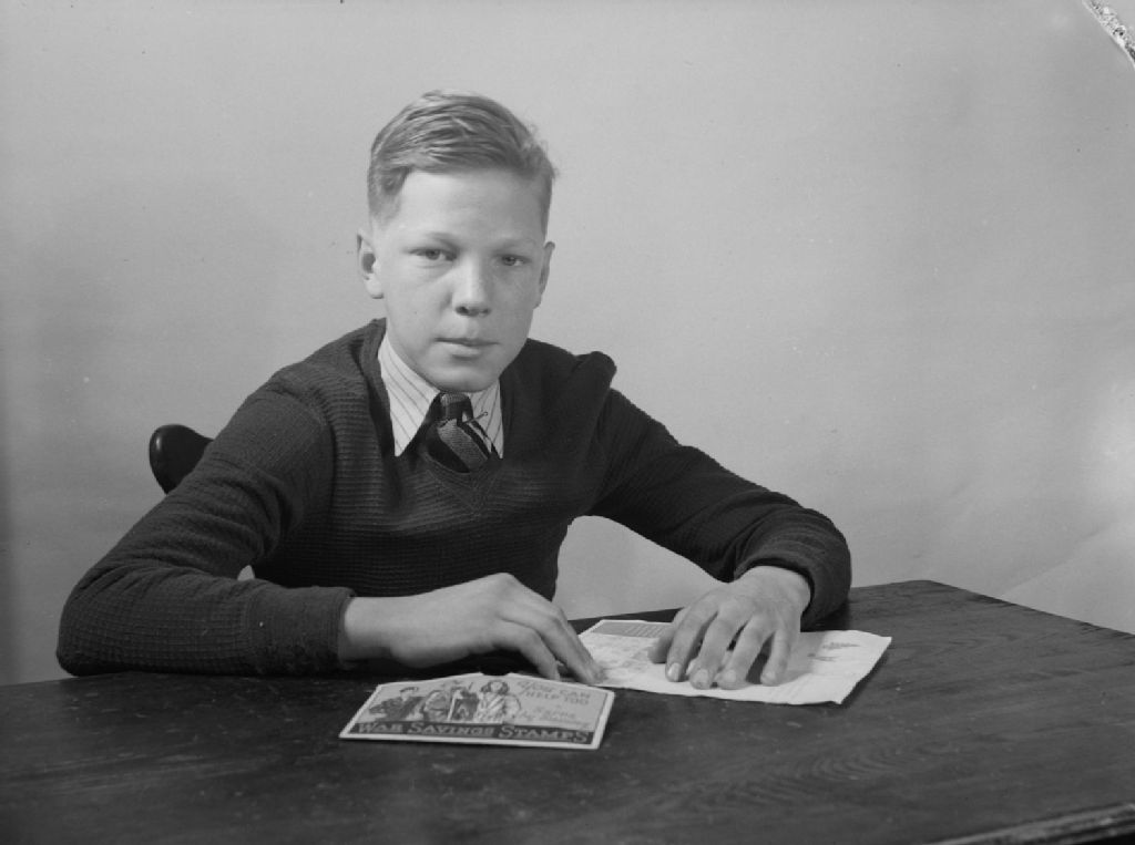 Phillip Reed est assis à une table devant des coupons de ravitaillement de guerre ou «War Savings Stamps»